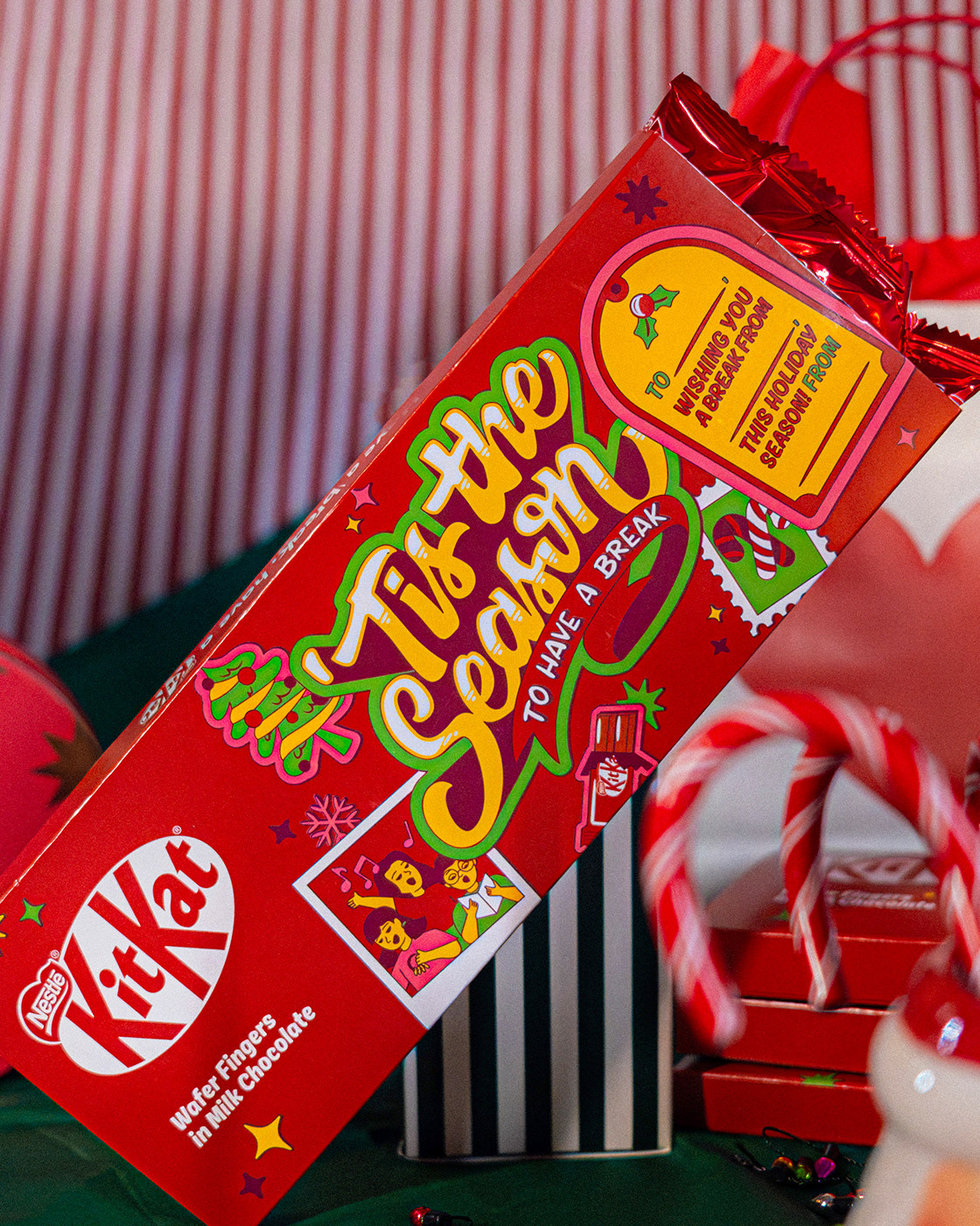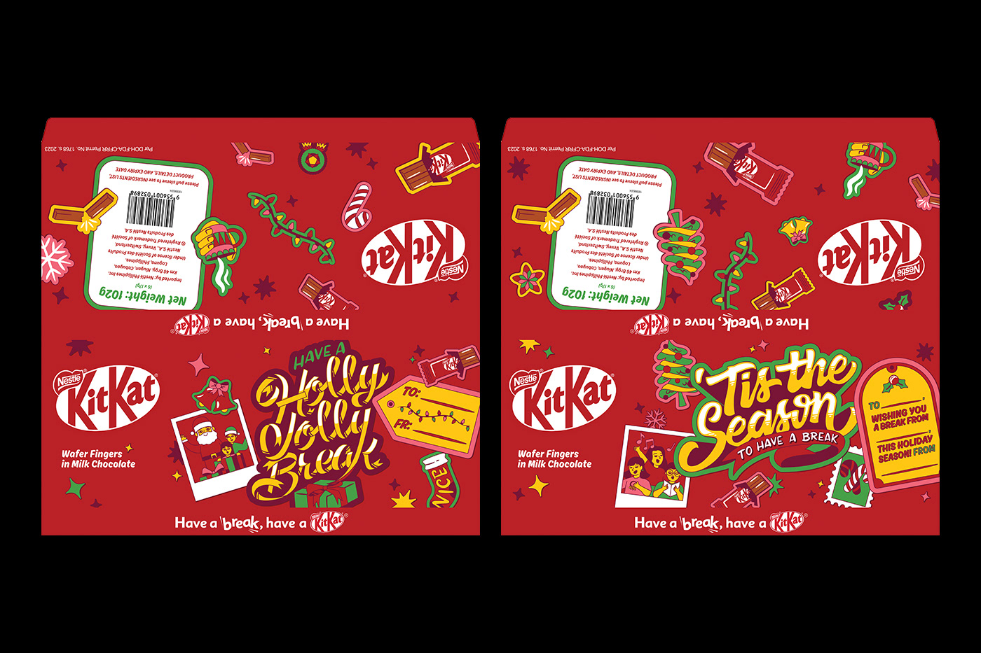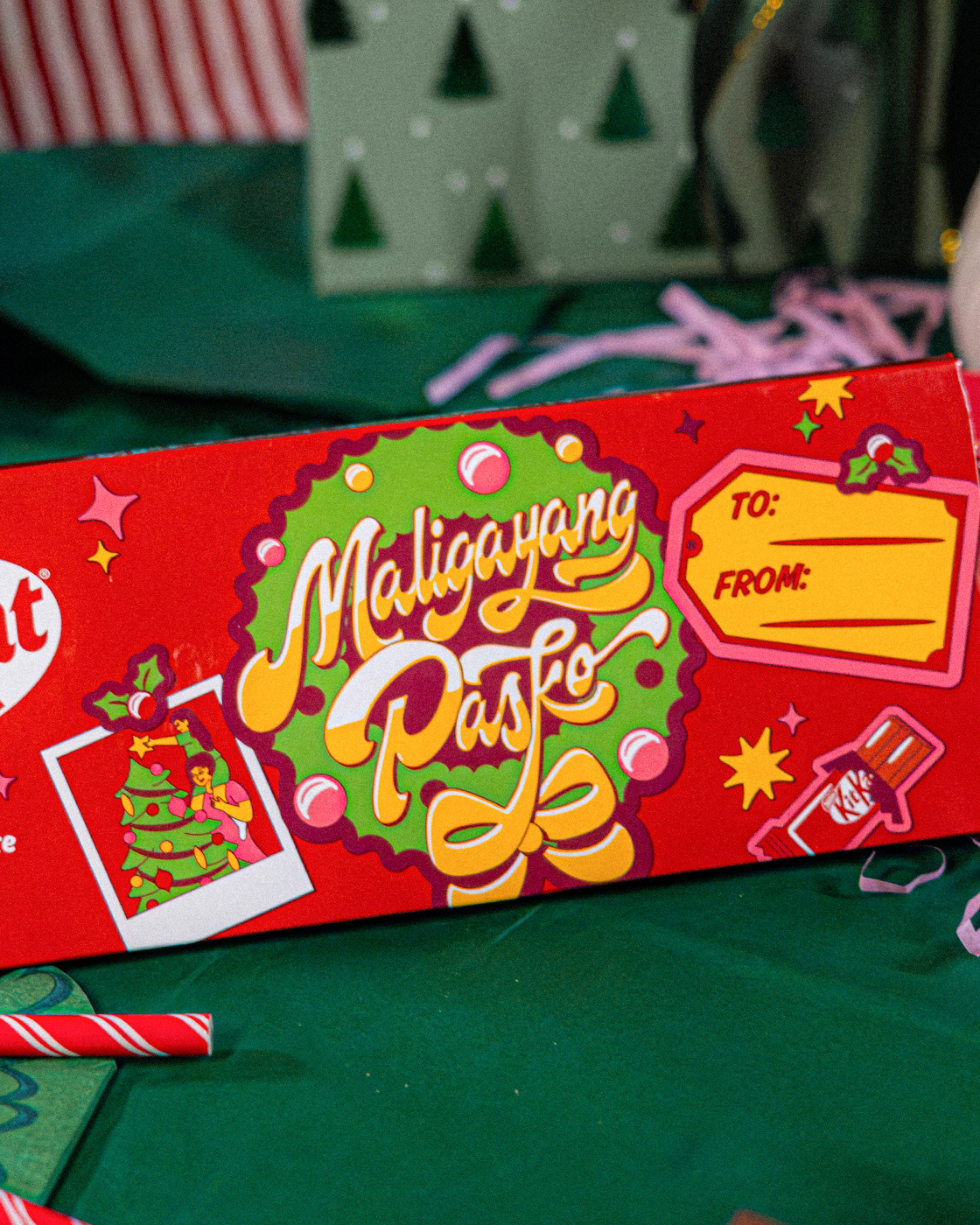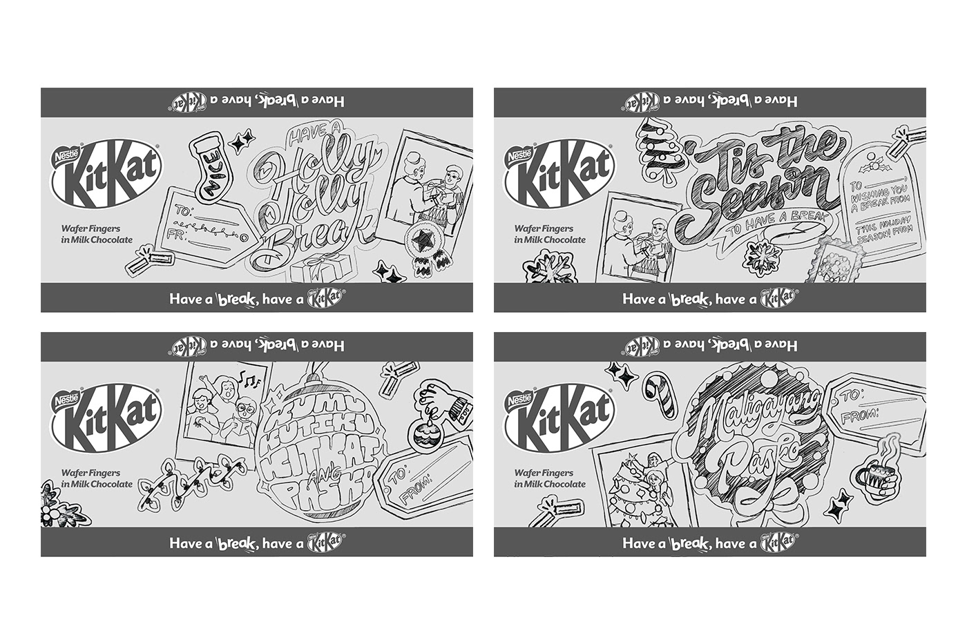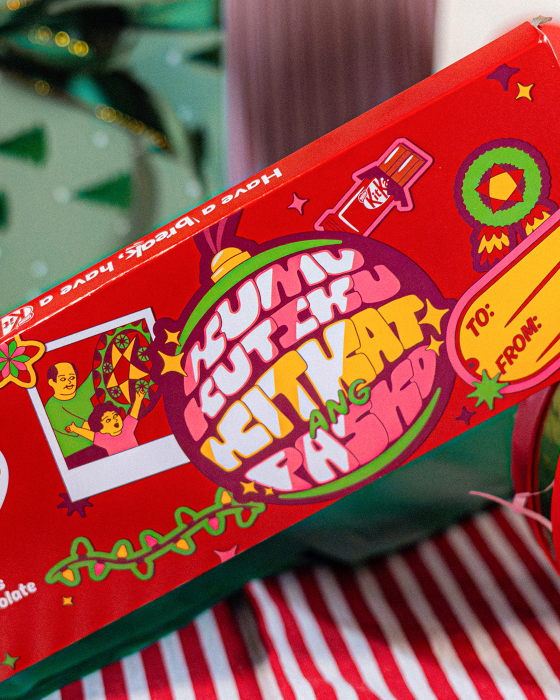 For the concept, I wanted to bring together the charm of traditional Christmas cards and the fun of social media stickers. So I created distinct type lockups that feature a short holiday greeting, weaving in KitKat's tagline of 'Have a break' and Filipino greetings. I also added an integrated gift tag so it’s more convenient for gifting.